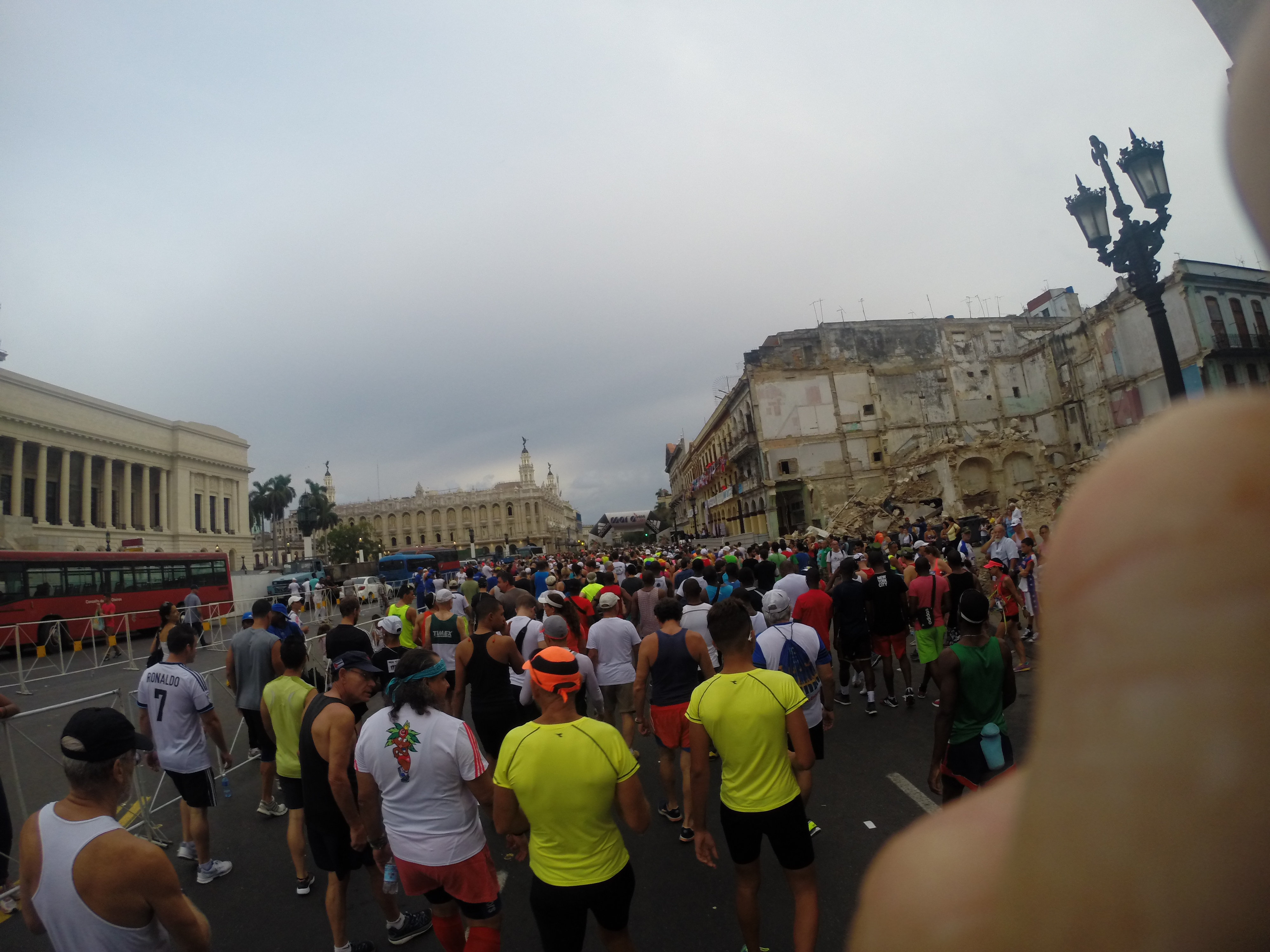 Luckily, the weather was breezy and cloudy so the sun was not a factor. It was still dark when we got to the start line and the buildings were lit up and the National Capital was covered in staging. It had a metal fence around it, but the start line was alive with live music.